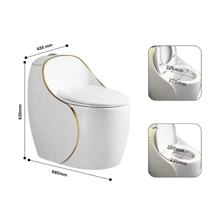 কমোডের রঙ হোয়াইট/গোল্ডেন, যা যেকোনো বাথরুমের সাথে মানানসই এবং আড়ম্বরপূর্ণ লুক প্রদান করে। এর আয়তন 680x635x435 মিমি, যা ব্যবহারকারীর আরাম নিশ্চিত করে।